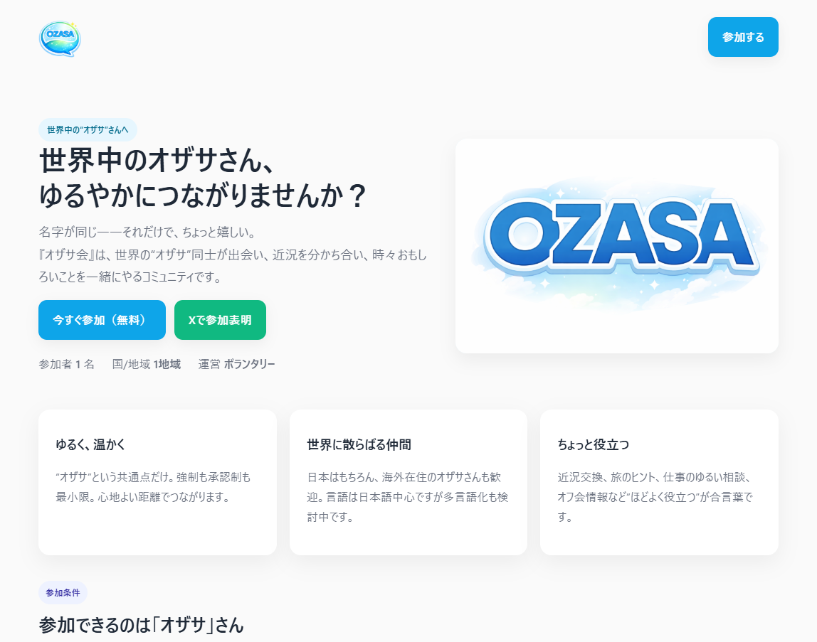 「オザサ会」は、世界中の“オザサ”同士が出会い、近況を分かち合い、ときどき面白いことを一緒にやる、ゆるく温かいコミュニティです。